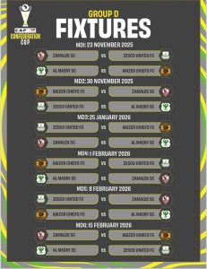 الجولة الثانية : ويلتقي خلالها المصري خارج أرضه مع مضيفه فريق زيسكو يونايتد الزامبي في الثلاثين من نوفمبر الجاري.